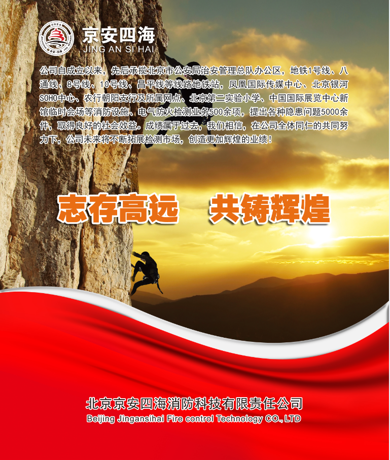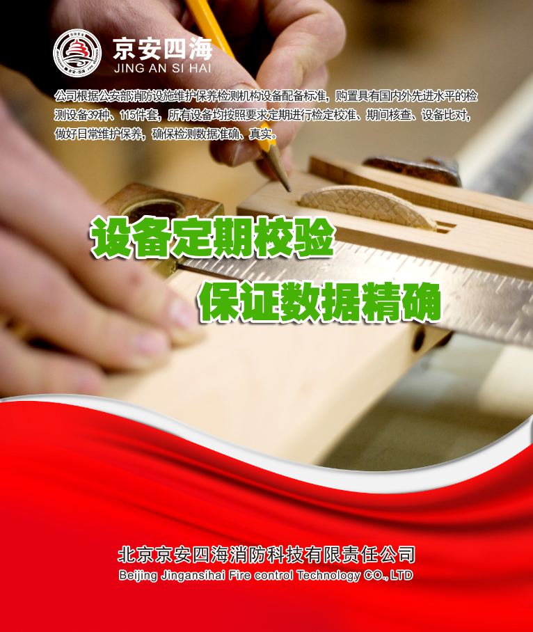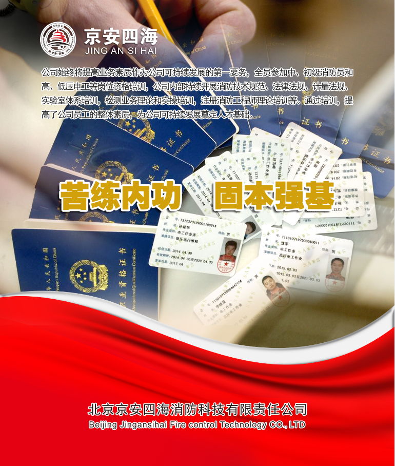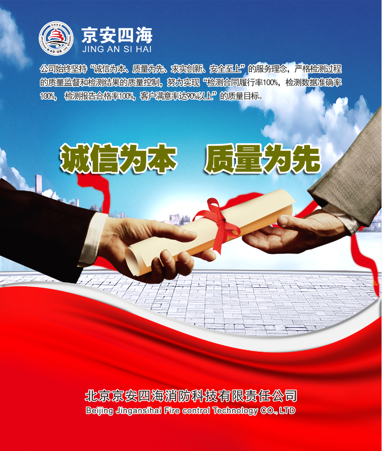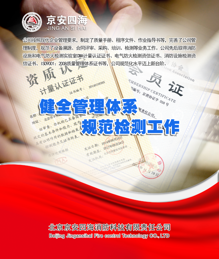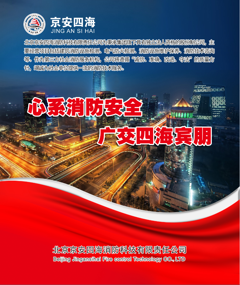 北京京安四海消防科技有限責任公司成立于2012年,注冊資金600萬元,是北京市消防協會理事單位,也是北京消防協會消防設施分委會和電氣防火分委會副主任委員單位。具備從事建筑消防設施技術檢測、電氣防火技術檢測、消防設施維護保養、消防安全評估等消防技術服務的資質和技術能力。